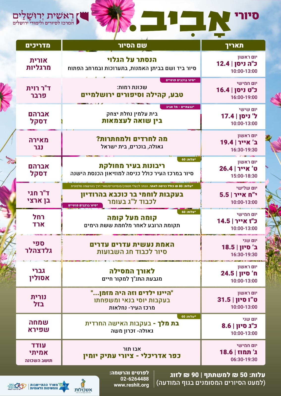 עלות: 50 ₪ למשתתף | 90 ₪ לזוג (למעט הסיורים המסומנים בגוף המודעה)